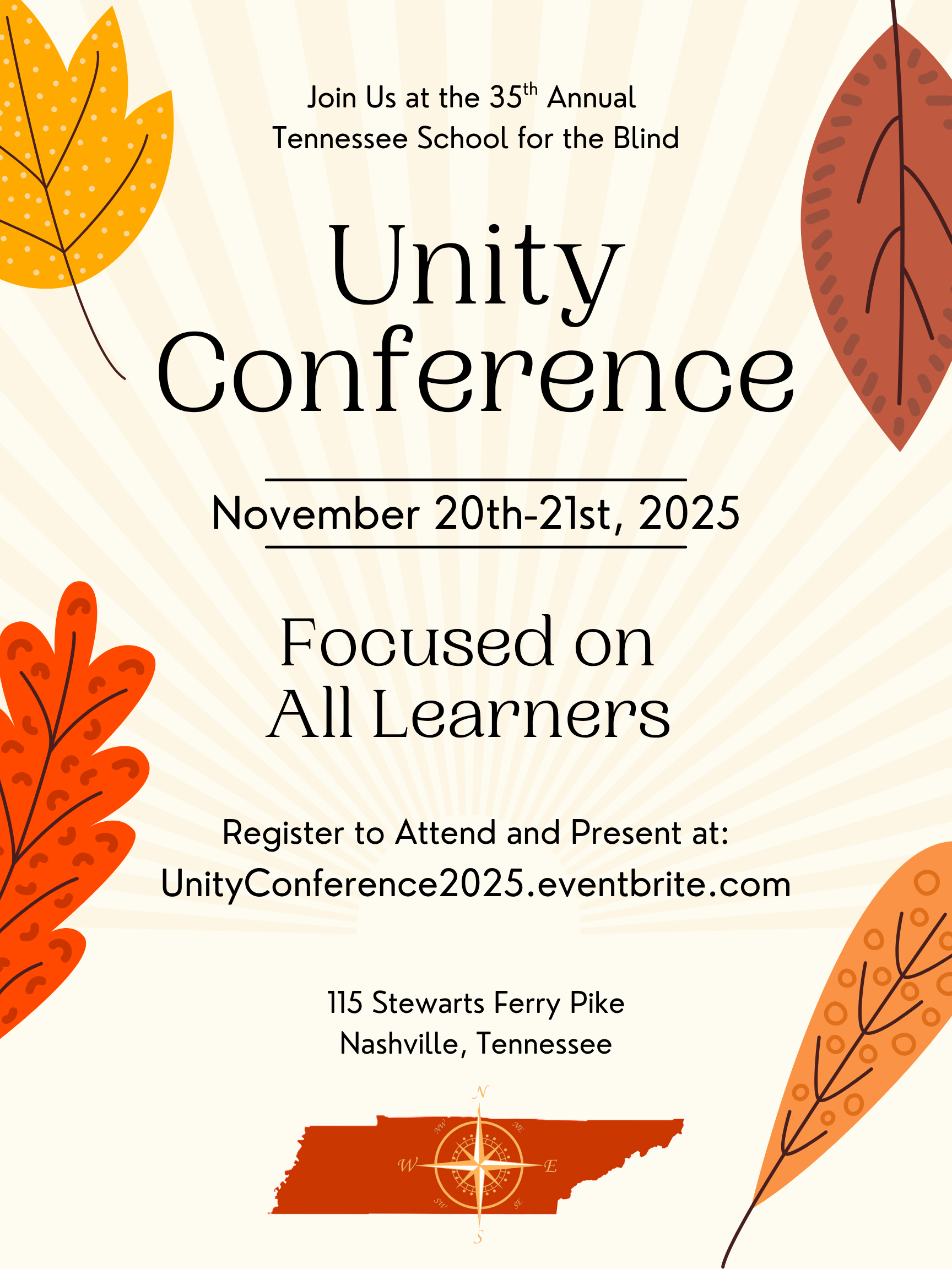 The 2025 Unity Conference will take place November 20-21, 2025! We look forward to welcoming you to the TN School for the Blind.